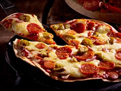 Jednu tortillu namažte po celém povrchu sýrem a položte na ni druhou placku. Tvar pizzy můžete nožem upravit podle velikosti pečicího košíku vaší horkovzdušné fritézy.