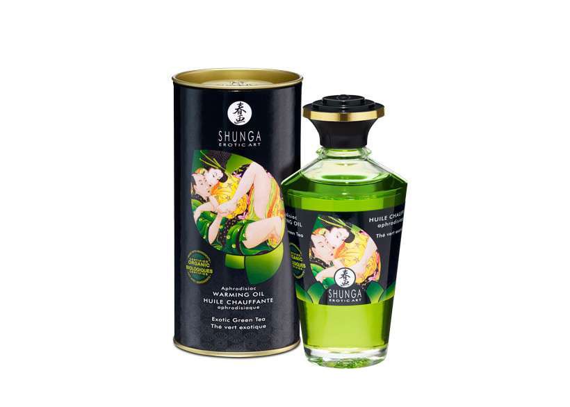 Skvělý dárek pro společné intimní chvilky. Hřejivý jedlý afrodiziakální olej Shunga Aphrodisiac Warming Oil Green Tea se prodává v krásném flakonu a jeho hřejivý efekt aktivujete vlastním dechem a polibky, proto je určen především pro masáž erotogenních zón. Prodává e-shop ErosStar za 595 Kč (100 ml)Foto: Archiv firmy