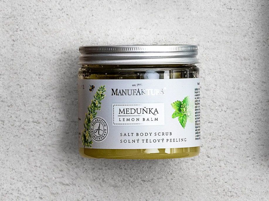 Vysoce přírodní solný peeling na tělo s meduňkou, vřídelní solí, cennými oleji a svěží bylinnou vůní promění koupelnu v malé domácí lázně. Jemně exfoliuje, vyživuje a revitalizuje pokožku a zanechává ji sametově hebkou, vyživenou a zářivou. 335 Kč, prodává ManufakturaFoto: Archiv firmy