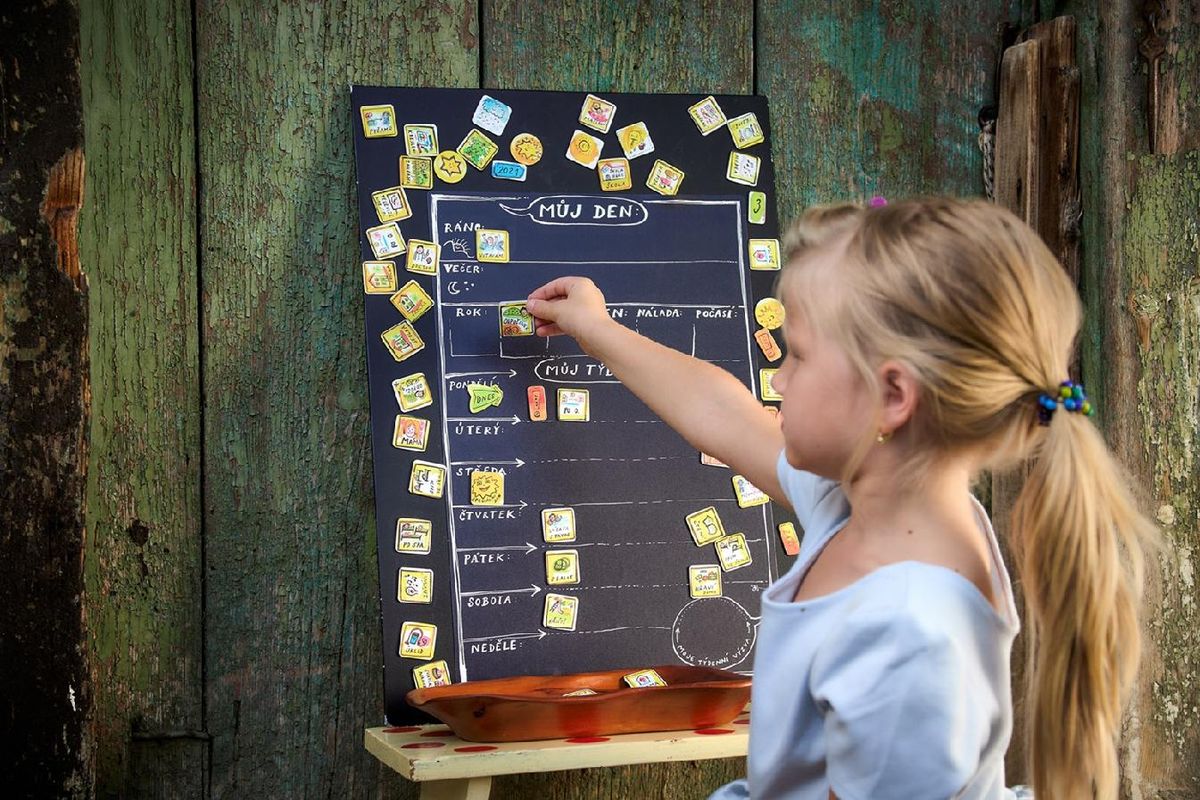 Plánovač pro děti od 3 let zahrnuje magnetickou podložku a tematické magnety. Vše je omyvatelné, odolné a vyrobené v ČR v lokální tiskárně. Kupují se jednotlivé komponenty, prodává e-shop Čáromat, deska od 350 do 650 Kč, základní sada magnetek za 350 KčFoto: Archiv firmy