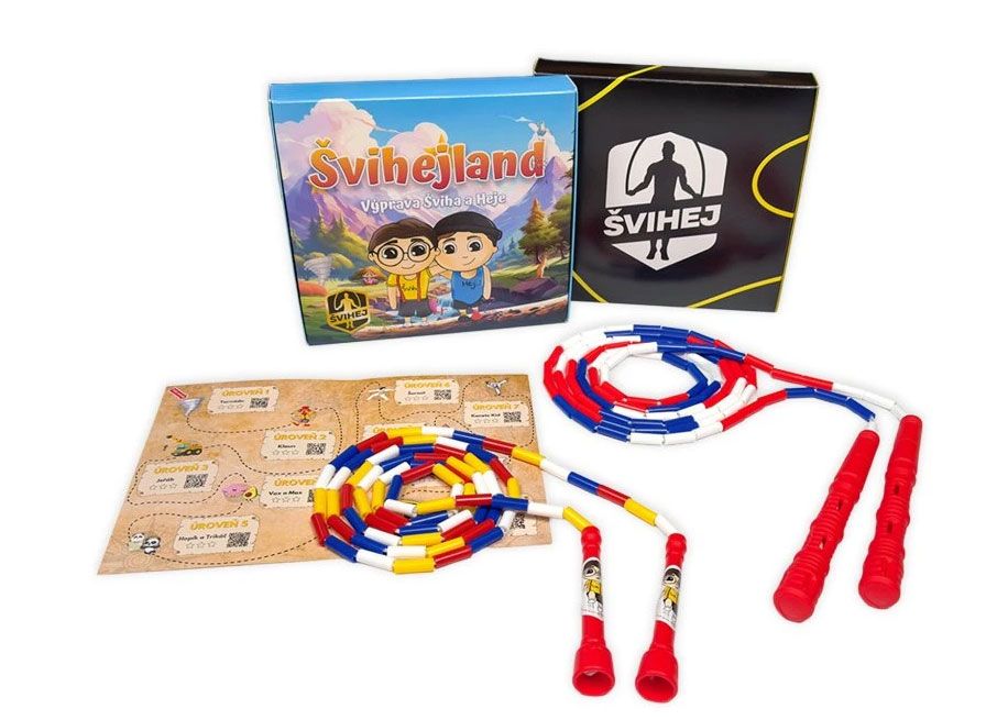 Balíček plný pohybu obsahuje dětské švihadlo, hru Švihejland, hrací kartu, omalovánky, pastelky, sáček na švihadlo a zábavné úkoly s odměnami, jejichž součástí jsou QR kódy odkazující na videa. Sada je určená pro děti od 4 do 9 let (do výšky 160 cm). Prodává e-shop Svihej za 699 KčFoto: Archiv firmy