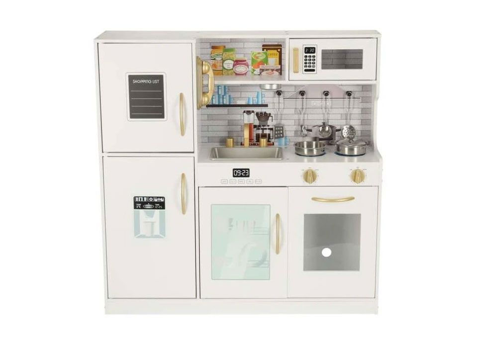 Dřevěná kuchyňka se skládá z chladničky s mrazákem, myčky, mikrovlnky, sporáku i trouby a obsahuje i kovové nádobí. Prodává Čisté dřevo za 2 039 KčFoto: Archiv firmy