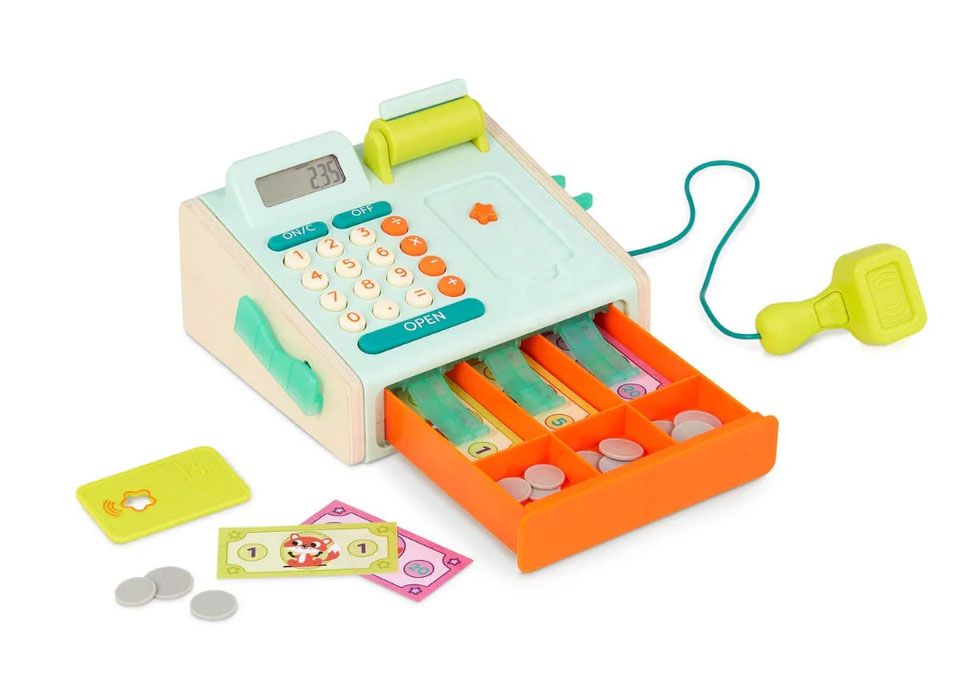 Dětská vysouvací pokladna B.Toys se skenerem a čtečkou karet je určena dětem od 3 let. Má tlačítka se zvuky, výsuvnou účtenku, skenovací pistoli, bankovky, mince a platební karty. Prodává 4kindspoint za 1 339 KčFoto: Archiv firmy