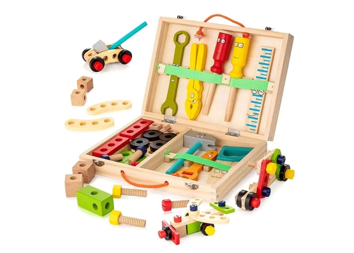 Montessori sada nářadí a stavebnice pro intenzivní rozvoj kreativity a jemné motoriky je určena dětem od 2 let. V dřevěném boxu je 34 dílů: 8 nástrojů a 26 dílků stavebnice. Prodává Hurato za 599 KčFoto: Archiv firmy