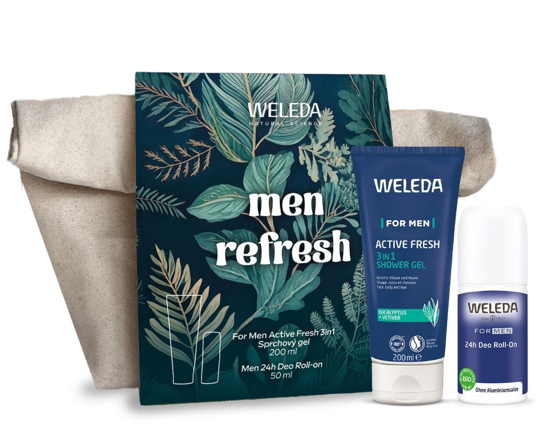 Drobným dárkem, který se nikdy neztratí, je voňavý dárkový set Weleda se sprchovým gelem 3v1 a deodorantem s 24hodinovou ochranou bez použití hliníkových solí. Produkty jsou zabalené ve stylové bavlněné taštičce. Balíček Men Refresh pořídíte za 349 KčFoto: Archiv firmy