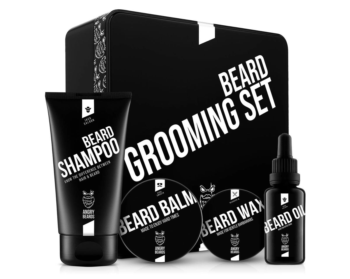 Pryč jsou doby, kdy si vousy žily vlastním životem. Dárková sada v plechové krabičce obsahuje všechno, co je pro jejich údržbu potřeba. A ještě něco navíc! V balíčku Angry Beards najdete šampon, olej, balzám a vosk na zkrocení neposedných vousů. Jeho cena je 1 599 KčFoto: Archiv firmy