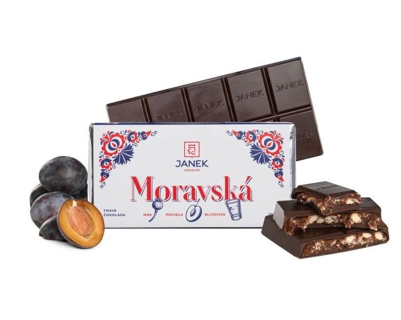 Tahle Jankova čokoláda v sobě ukrývá kombinaci povidel s upečenou drobenkou jako z babiččina frgálu a k tomu všemu jemný dotek pravé moravské slivovice od Žufánka! Plněnou moravskou čokoládu prodává Čokoládovna Janek za 429 KčFoto: Archiv firmy