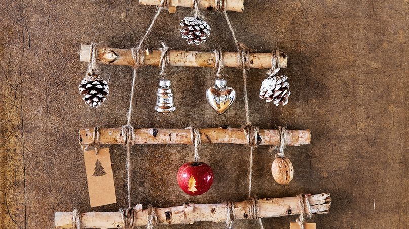 Jak si udělat závěs z větve na dveře? Najděte silnější kus lehce křivolaké větve (krásně působí zejména bříza), tavnou pistolí k ní připevněte stuhy a provázky a na ně zavěste rozmanité dekorace: sušené pomeranče a citrony, svitky skořice, hvězdičky badyánu, dřevěné zvonky, hvězdy a vločky, malé perníčky nebo rolničky. Větev pak připevněte na dveře nebo těsně nad ně.