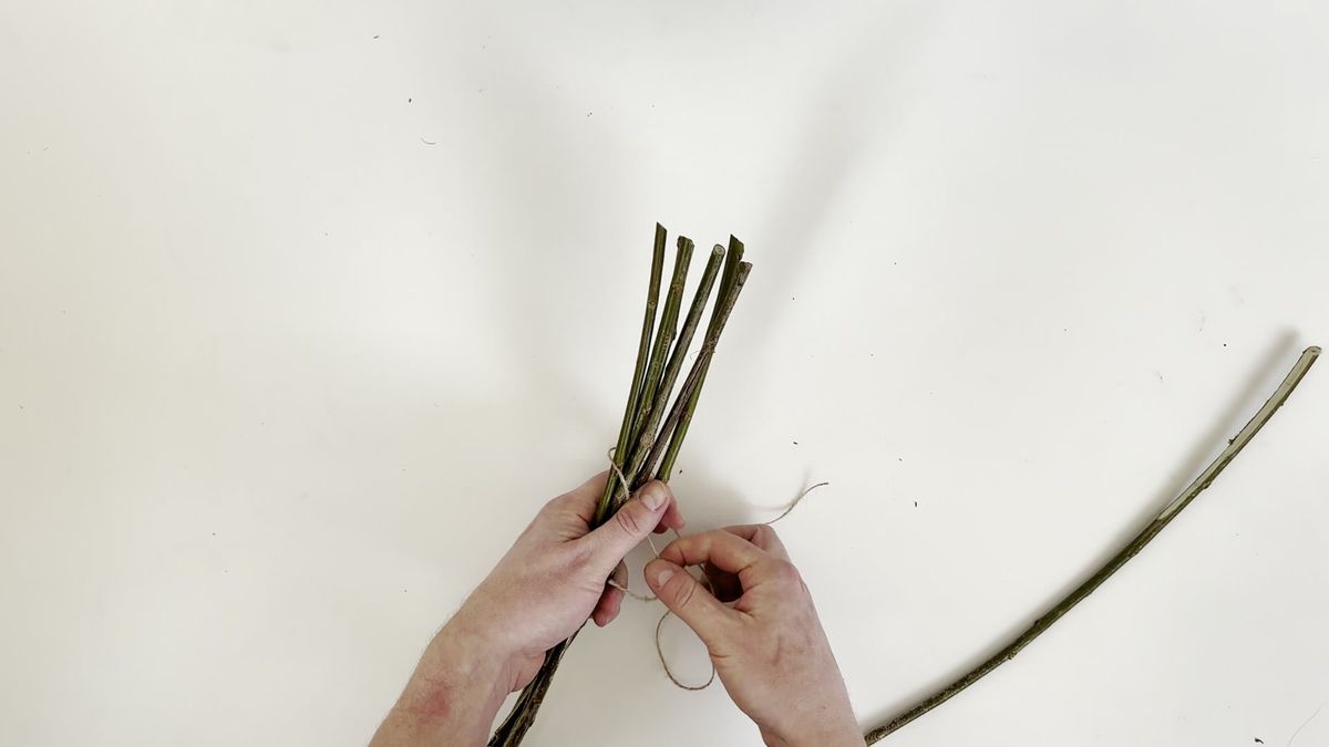 Silnější konec tenkého proutku lehce seřízněte a zasuňte mezi ostatní, následně omotejte jako rukojeť a pevně utáhnete. Konec zkraťte, provlečte středem a schovejte, ať není vidět.