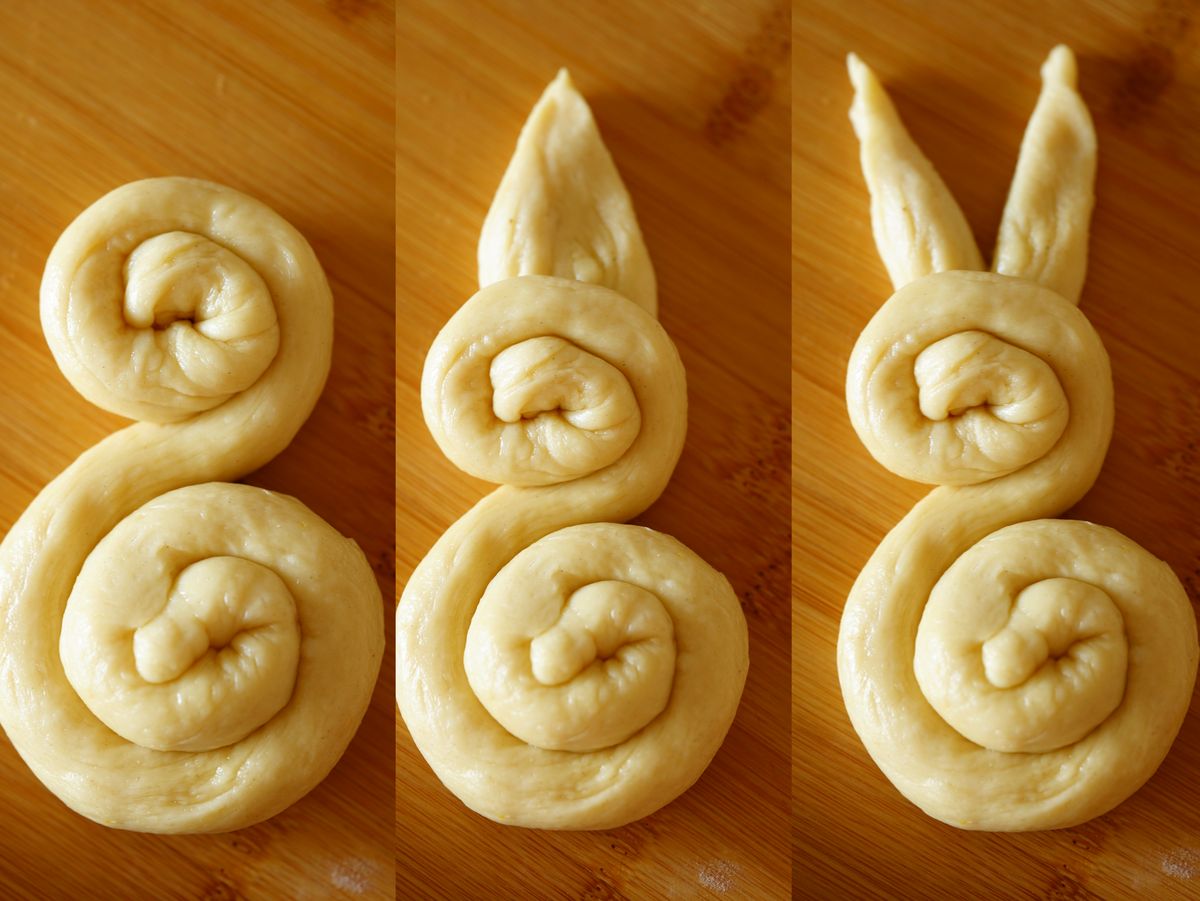 Vykynuté těsto rozdělte na 10 dílů. Z každého kousku odřízněte asi třetinu. Z většího dílu vytvarujte „hada“ a stočte ho do tvaru S – vznikne tělo a hlava zajíčka. Z menšího kousku vytvořte uši: stačí těsto rozstřihnout velkými nůžkami a připevnit k hlavičce. Zajíčky nechte kynout pod čistou utěrkou ještě asi 20 minut na plechu s pečicím papírem. Mezitím předehřejte troubu na 190 °C.