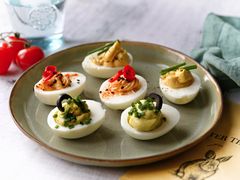 Upečená hnízda nechte v muffinové formě zchladnout a pak je opatrně vyndejte. Naplňte je vaječnou pomazánkou a poté ozdobte vařenými křepelčími vejci, nasekanou nakládanou feferonkou a sekanou čerstvou pažitkou.
