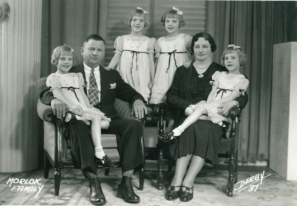 Čtyřčata se svými rodiči, matkou Sadie a otcem CarlemFoto: Morlok Family Scrapbook, courtesy of Forest Parke Library and Archives, Capital Area Di