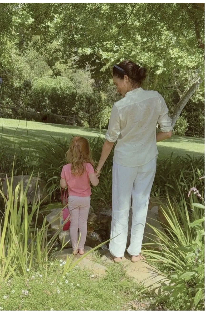Na snímku, který Meghan zveřejnila 11. října na instagramu, je vidět maminku a dceru, jak se drží za ruce. Meghan, oblečená ve světlém, minimalistickém outfitu (protože i v roli mámy se dá vypadat jako z editoriálu Vogue), se s úsměvem sklání ke své dceři.
