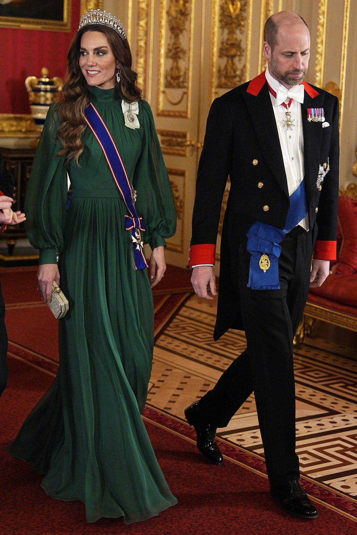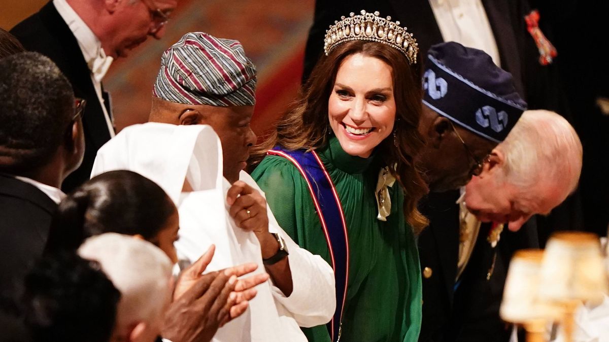 Princezna Catherine je známá svým přepečlivým výběrem šatů pro slavnostní příležitosti a ani tentokrát neponechala nic náhodě. Pro státní banket ve Windsoru zvolila smaragdově zelenou večerní róbu od singapursko-francouzského návrháře Andrewa Gn, speciálně navrženou pro tuto příležitost a vybranou jako poctu státním barvám Nigérie.