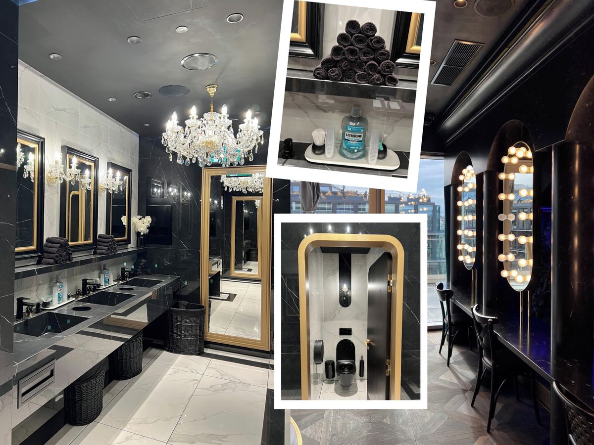 Nadchne vás i samotný interiér. Kombinace černého a bílého mramoru doplněná křišťálovými lustry působí opravdu impozantně! Ještě před vstupem na toalety navíc najdete prostor s řadou osvětlených zrcadel, kde se můžete pohodlně posadit a upravit. Ať už potřebujete doladit make-up nebo účes.