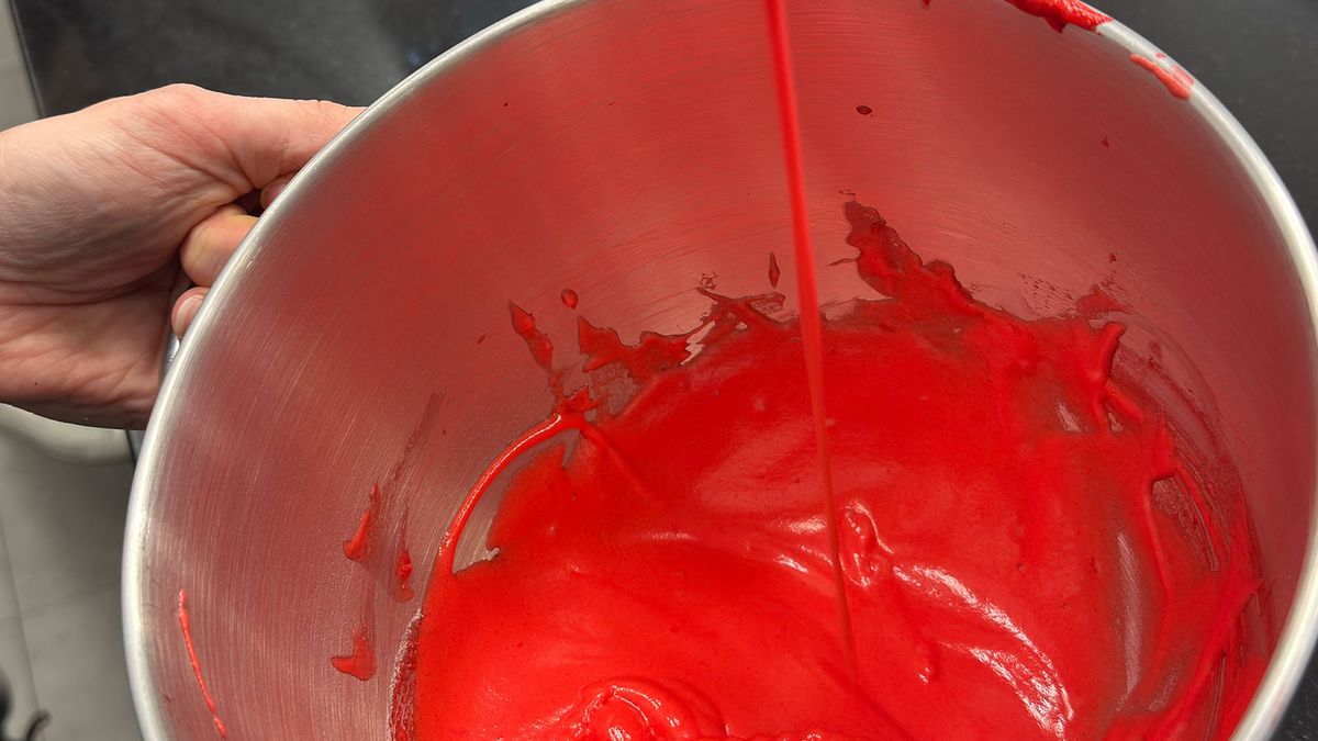 - Těsto musí pomalu stékat ze stěrky a tvořit hladkou „stuhu“, která se během pár sekund ztratí. Příliš hustá směs dělá špičky a vede k popraskaným makronkám, příliš řídká se zase rozlévá a vytváří ploché skořápky.
