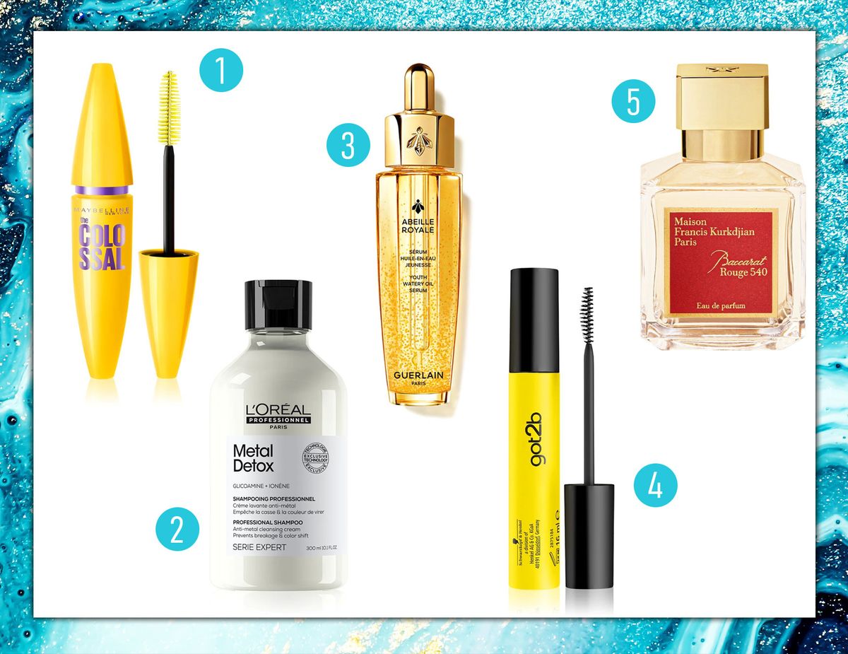 1. Řasenka pro objem řas The Colossal, Maybelline, 200 Kč, prodává Notino 2. Hloubkově čisticí šampon L’Oréal Professionnel Serie Expert Metal Detox, 549 Kč (300 ml), prodává Douglas 3. Vyživující olejové sérum Guerlain Abeille Royale Youth Watery Oil Serum, 1 520 Kč (15 ml), prodává Sephora 4. Gel na obočí got2b Glued, 169 Kč, prodává dm drogerie 5. Parfemovaná voda Maison Francis Kurkdjian Baccarat Rouge, 6 500 Kč (70 ml), prodává Ingredients storeFoto: Archiv firem