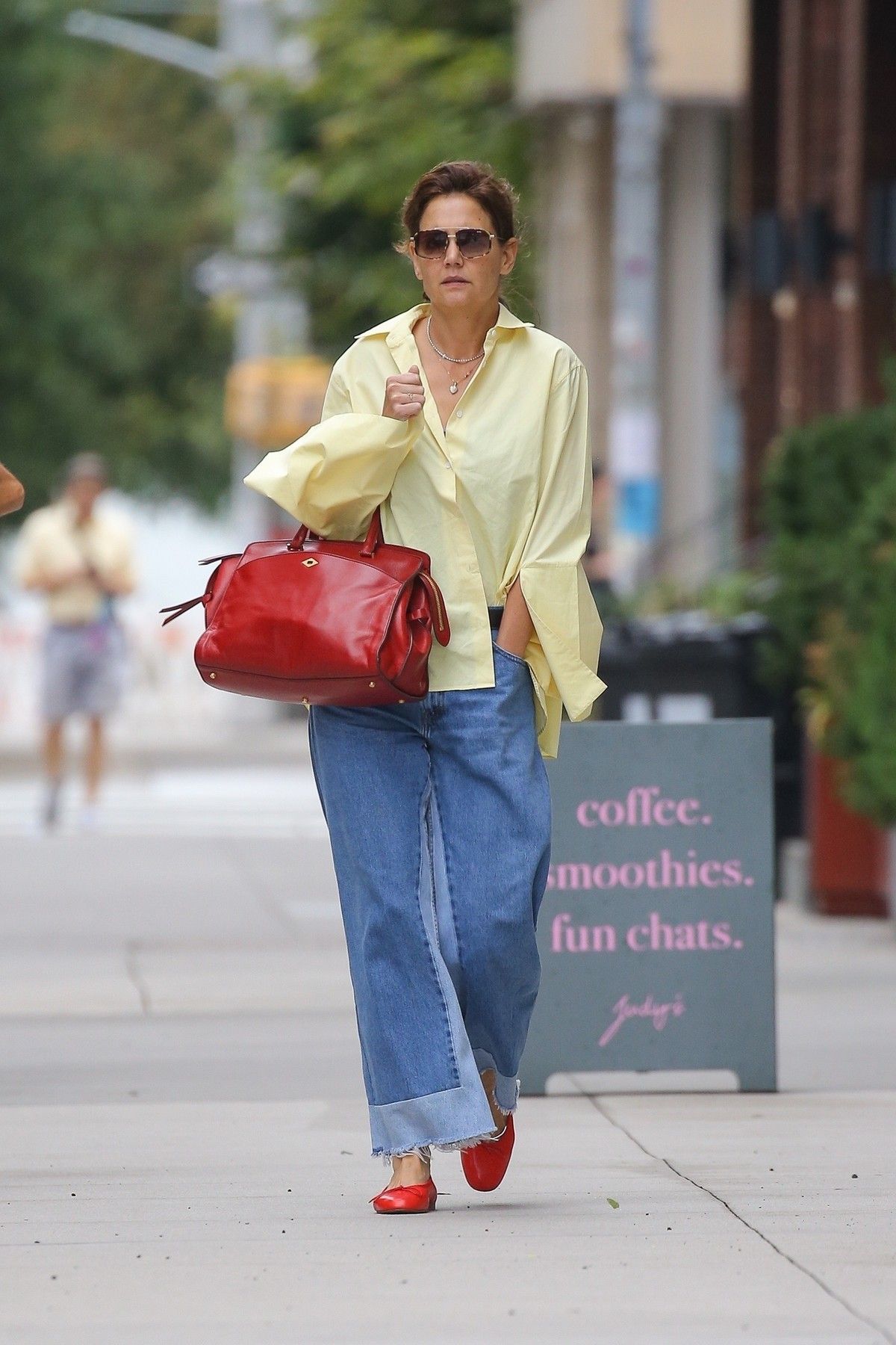 Široké džíny jsou teď in, což je skvělá zpráva. Slibují totiž naprosté pohodlí. Katie Holmes k nim oblékla jednoduchou oversize košili ve světle žluté barvě a je to příjemná změna oproti bílé klasice.
