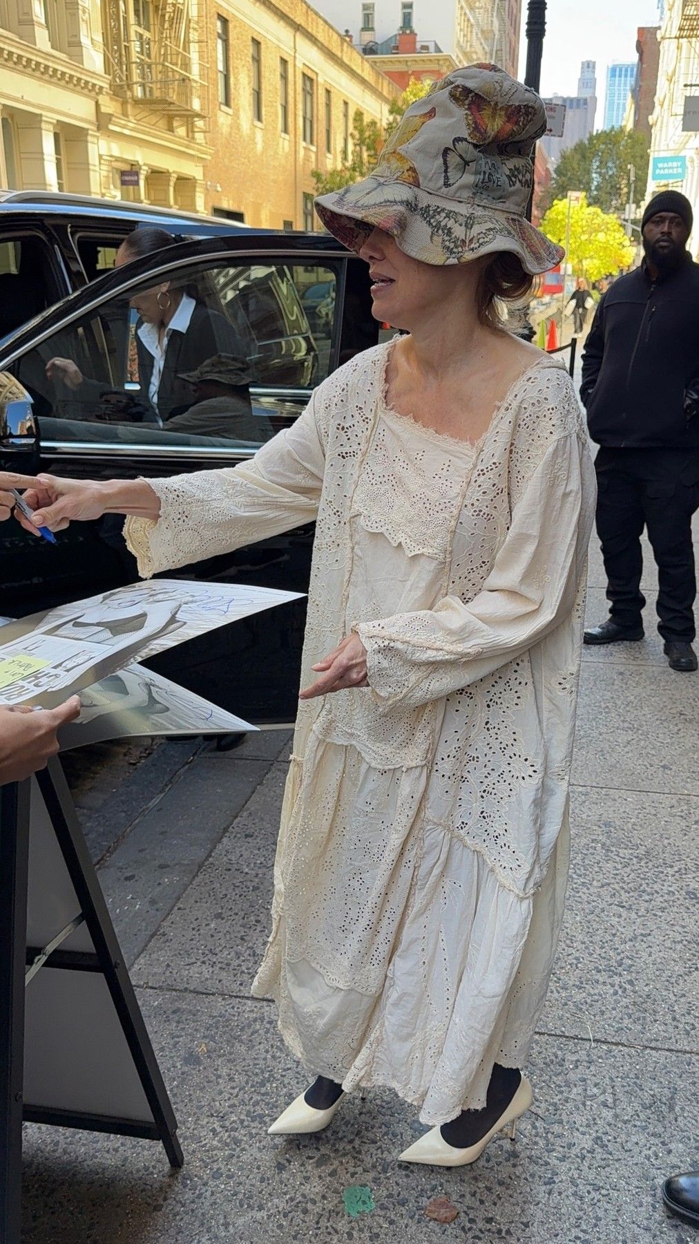 Doplnila je bláznivými zelenými punčocháči s beruškami, jež k šatům neladily vzorem ani barvou. A jako bonus k tomu zmatku si na hlavu nasadila naprosto šílený klóbrc (tenhle kousek snad ani nelze nazvat kloboukem) od stejné značky jako šaty. Mimochodem tenhle doplněk si Anderson zjevně oblíbila, vynesla ho totiž i den před touto akcí, a ani tehdy to nebyl úplně dobrý nápad…