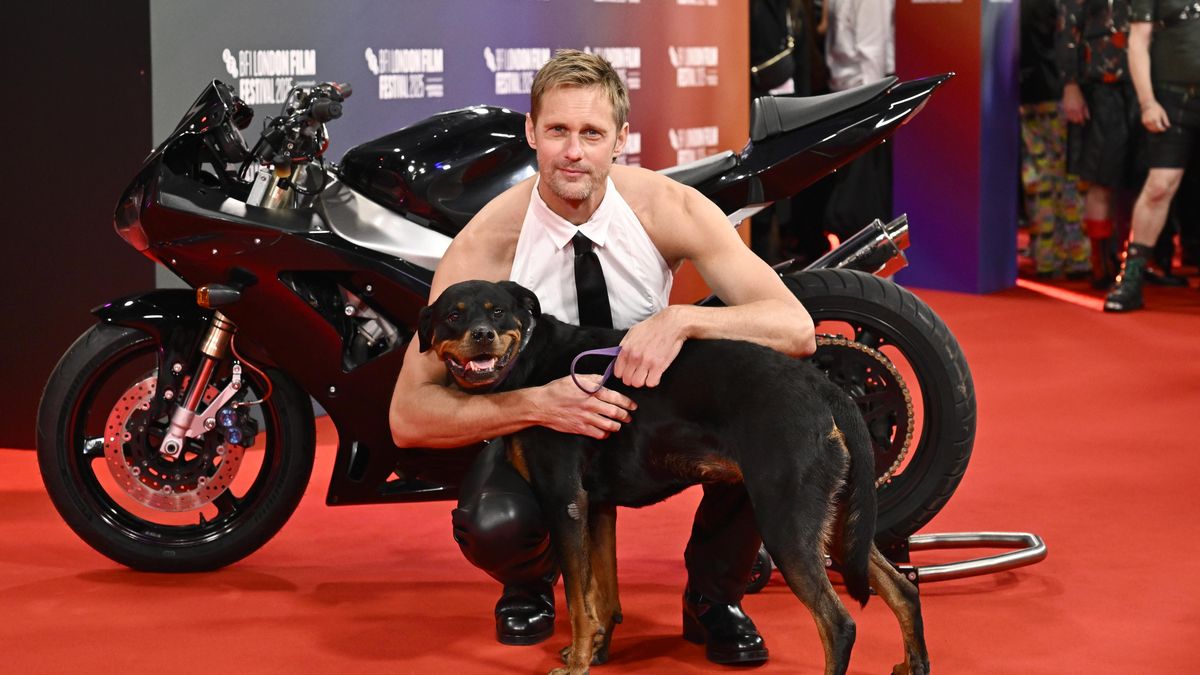Velice výstřední outfit oblékl k příležitosti londýnského filmového festivalu. Aktuálně totiž promuje film Pillion, který zkoumá témata sexuality a queer romance. Děj v kostce? Hlavní postava Colina (hraje ho Harry Melling) se zakouká do dominantního vůdce motorkářského gangu Raye (Alexander Skarsgard) a stane se jeho submisivním partnerem.