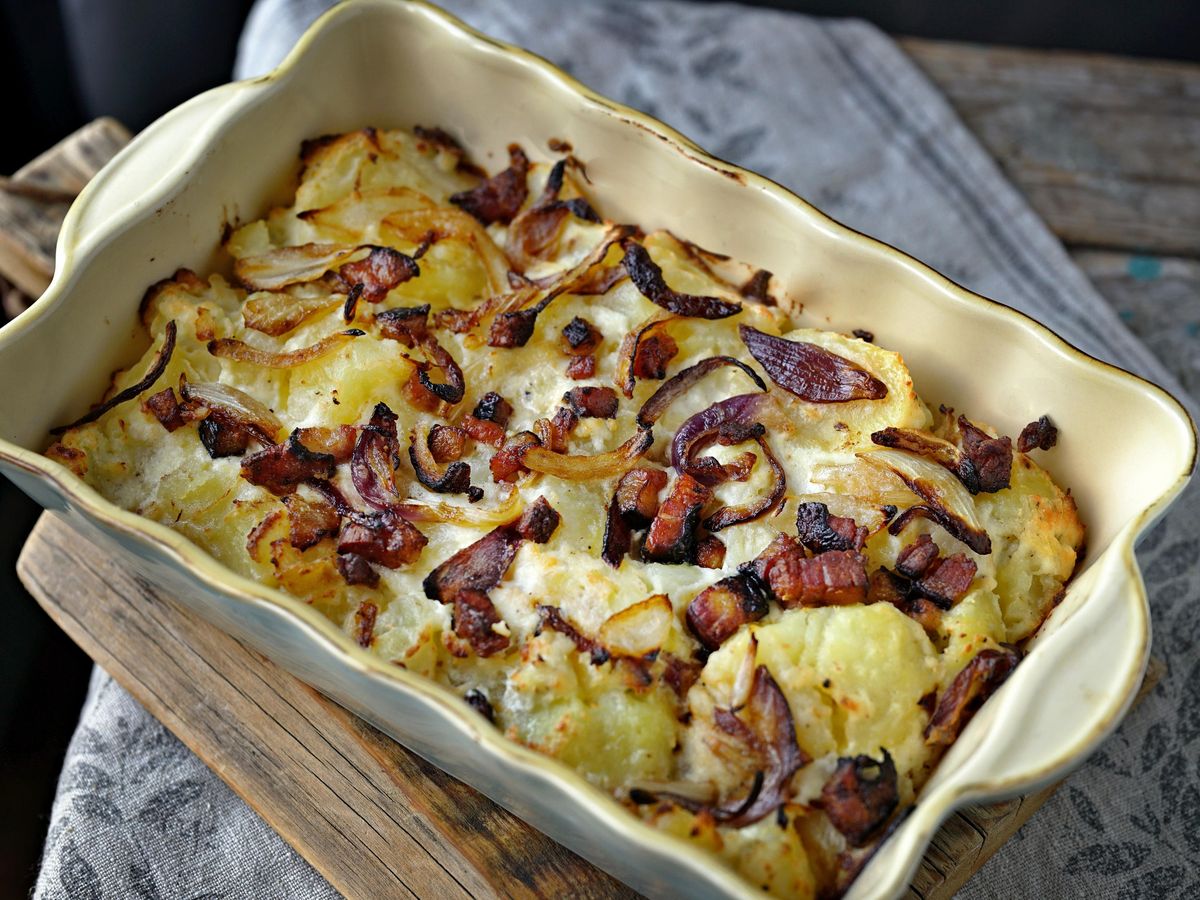 Gazdovské zapečené brambory s brynzou a slaninou. Jednoduchá večeře na slovenský způsob